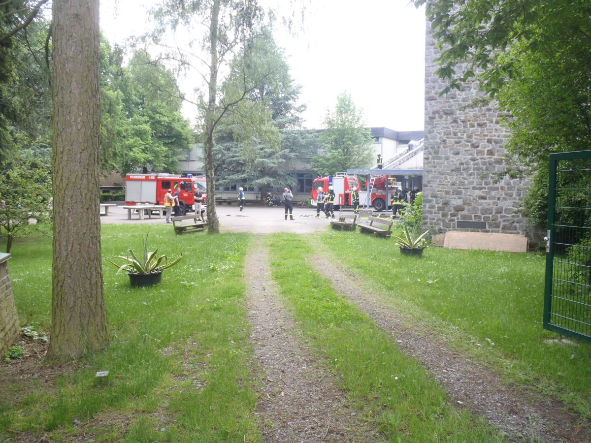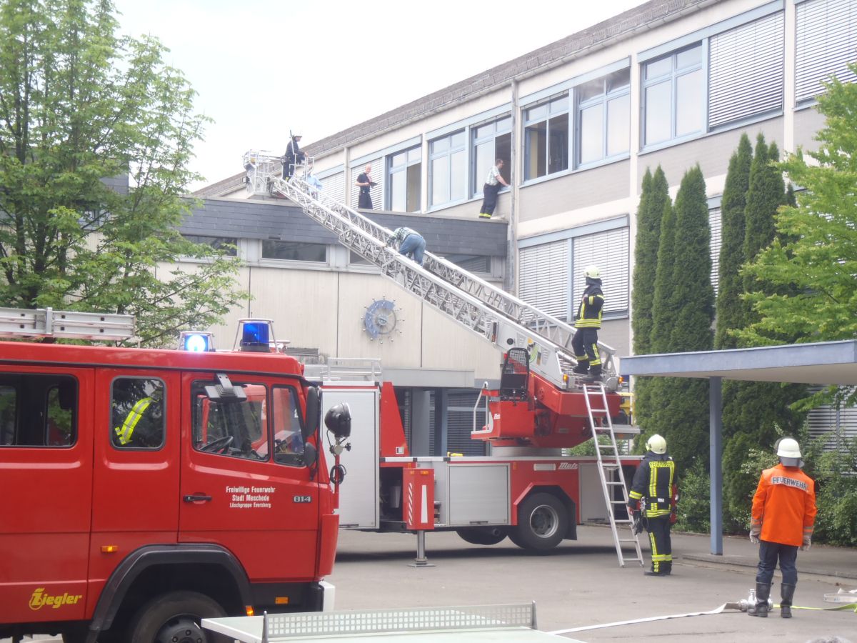 Die Aufgabestellung umfasste die Menschenrettung von zwei Personen mit anschließender Brandbekänpfung im Küchenbereich der Oase. Als weitere Herausforderung galt es eine durch einen Brand im Obergeschoss eingeschlossene Klasse mit 20 Kindern und 2 Begleitern zu retten und zu betreuen.