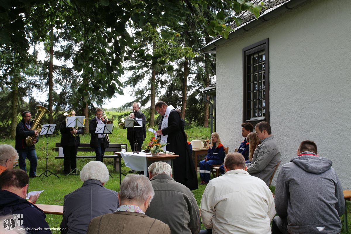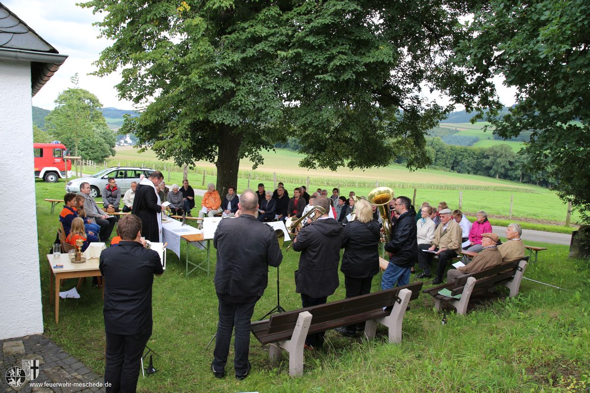 Die erste Station befand sich am Treffpunkt an der Klausenkapelle. Nach einen kurzem geschichtlichem Überblick zur Kapelle und einem Gebet begaben sich die Wallfahrer auf den Weg zur nächsten Station. Die zweite Station der Pilger war die Schladekapelle zwischen der „Windhäuser“ und Calle. Nach einigen Gebeten setzten sich die Teilnehmer in Richtung Calle in Bewegung. Am Caller „Dom“ war der erste Anlaufpunkt eine Erfrischungsstation mit kühlen Getränken. In der St. Severinus Kirche wurden ebenfalls einige Gebete gesprochen bevor es zum Ziel der Fußwallfahrt zur Halloh Kapelle nach Wallen ging. An der Wallfahrer Kapelle zur „Schmerzhaften Mutter“ wurden die Wallfahrer von Pater Reinald und rund 50 Kirchgängern aus dem Pfarrverbund Calle/Wallen begrüßt. Zum Ende der dreistündigen Wallfahrt wurde eine Feldmesse unter Beteiligung einer Abordnung des Musikzuges der Feuerwehr Meschede gefeiert.