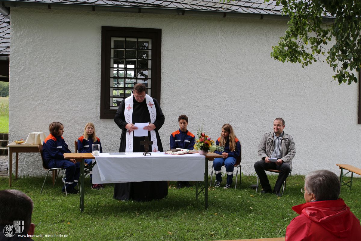 Hier wurden die Teilnehmer von Pater Reinald und Meschedes stellvertretenden Wehrleiter Johannes Thüsing (OIpe) und dem ehemaligen Wehrleiter Meinolf Kaiser begrüßt. Die Idee zu einer solchen Wallfahrt der ortsansässigen Rettungskräfte hatten Meinolf Kaiser, Notfallseelsorger Pater Reinald und Pastor Uwe Wiesner bei der Verabschiedung eines Löschgruppenführers im Jahre 2007 in Berge. Seitdem findet alle drei Jahre eine Wallfahrt von der Klausenkapelle in Meschede zum Kappellenweg des "Alten Kirchspiel" Calle, zum Halloh nach Wallen statt. Hierbei wird auf einem ein Teil der Kappellenrundweges gepilgert. Diese Wallfahrt wechselt sich mit einem Dankgottesdienst der Rettungskräfte ab. Bei seiner Begrüßung erklärte der Notfallseelsorger der Feuerwehr den „Pilgerpfad“ und die Gebete zur Besinnung auf dem Marsch. Auf dem Wallfahrtsweg wurde an drei Stationen, an Kapellen am Wege, angehalten. Hier zitierte Pater Reinald ein Kapitel aus dem Evangelium und brachte zu den jeweiligen Evangeliumsworten seine eigenen Gedanken hinzu.