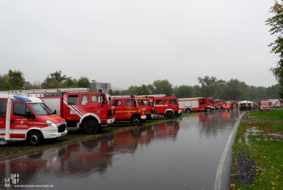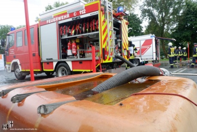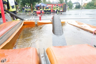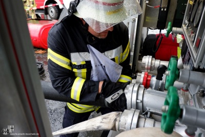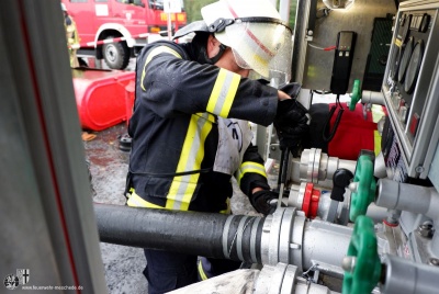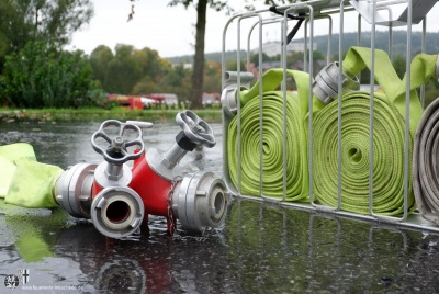 - Eine Saugleitung wird zusammengekoppelt und zu Wasser gelassen. Eine Schlauchleitung wird bis zum Verteiler verlegt. Von dort gehen dann drei weitere C-Leitungen bis zu den Strahlrohren ab.