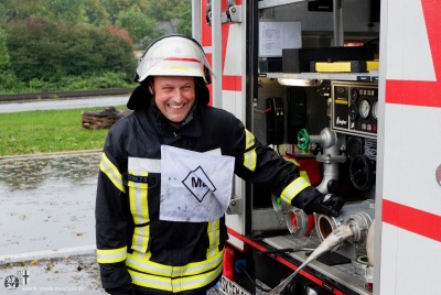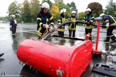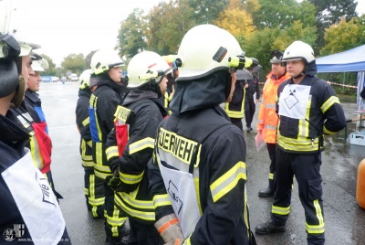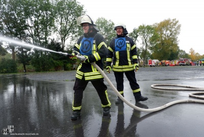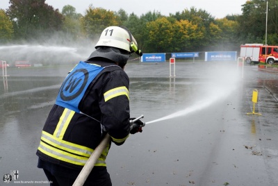 Zuletzt wird ein „Zielfeuer“, was per Klappe dargestellt wird, mit dem Wasserstrahl umgeworfen. Dann ist das Übungsziel erreicht und die Abschlussmeldung wird an den Schiedsrichter übermittelt. - Übungsende