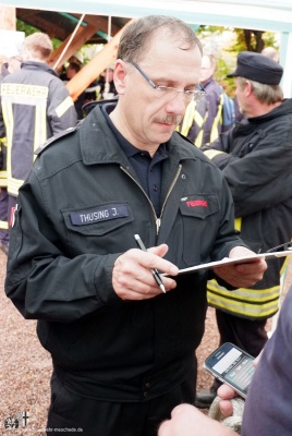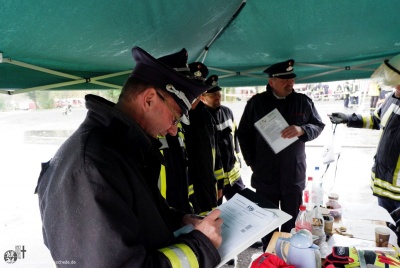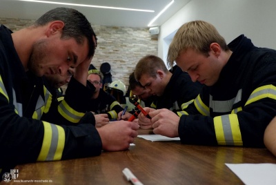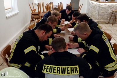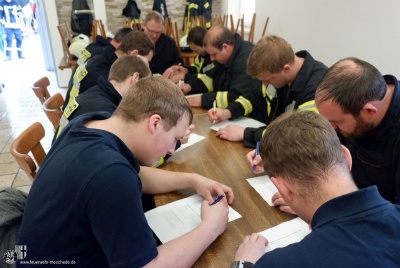 Schriftlich mussten verschiedene feuerwehrtechnische Fragen beantwortet werden. Umso schneller umso besser für die ganze Gruppe. Die Zeit wurde per Stoppuhr festgehalten.