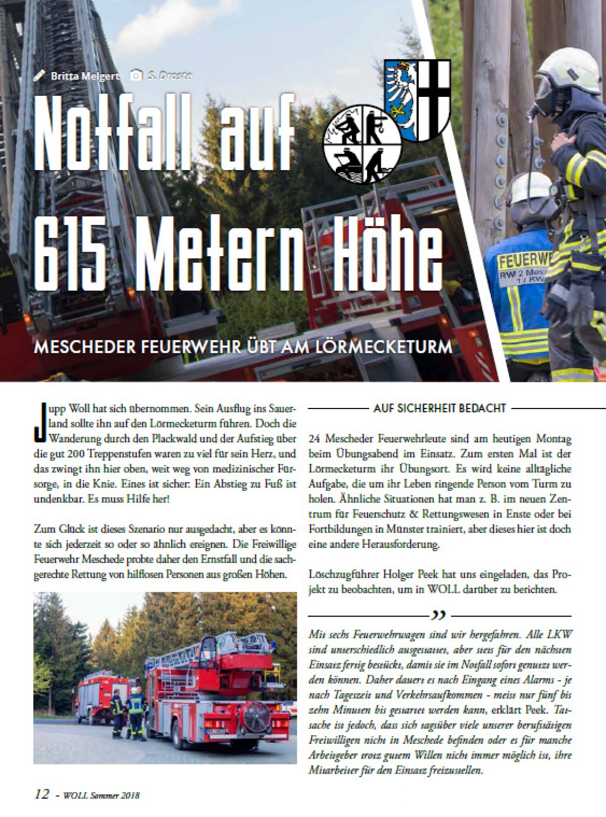 Jupp Woll hat sich übernommen. Sein Ausflug ins Sauerland sollte ihn auf den Lörmecketurm führen. Doch die Wanderung durch den Plackwald und der Aufstieg über die gut 200 Treppenstufen waren zu viel für sein Herz, und das zwingt ihn hier oben, weit weg von medizinischer Fürsorge, in die Knie. Eines ist sicher: Ein Abstieg zu Fuß ist undenkbar. Es muss Hilfe her! Zum Glück ist dieses Szenario nur ausgedacht, aber es könnte sich jederzeit so oder so ähnlich ereignen. Die Freiwillige Feuerwehr Meschede probte daher den Ernstfall und die sachgerechte Rettung von hilflosen Personen aus großen Höhen.