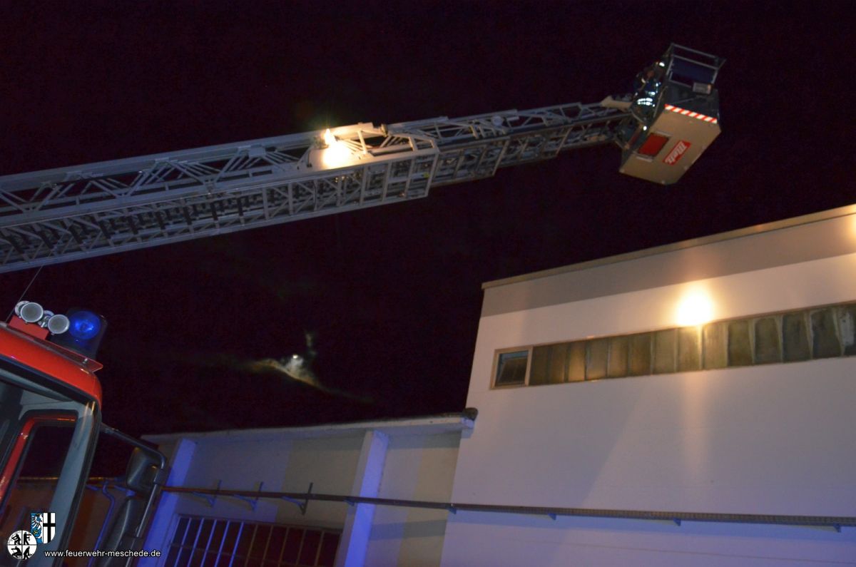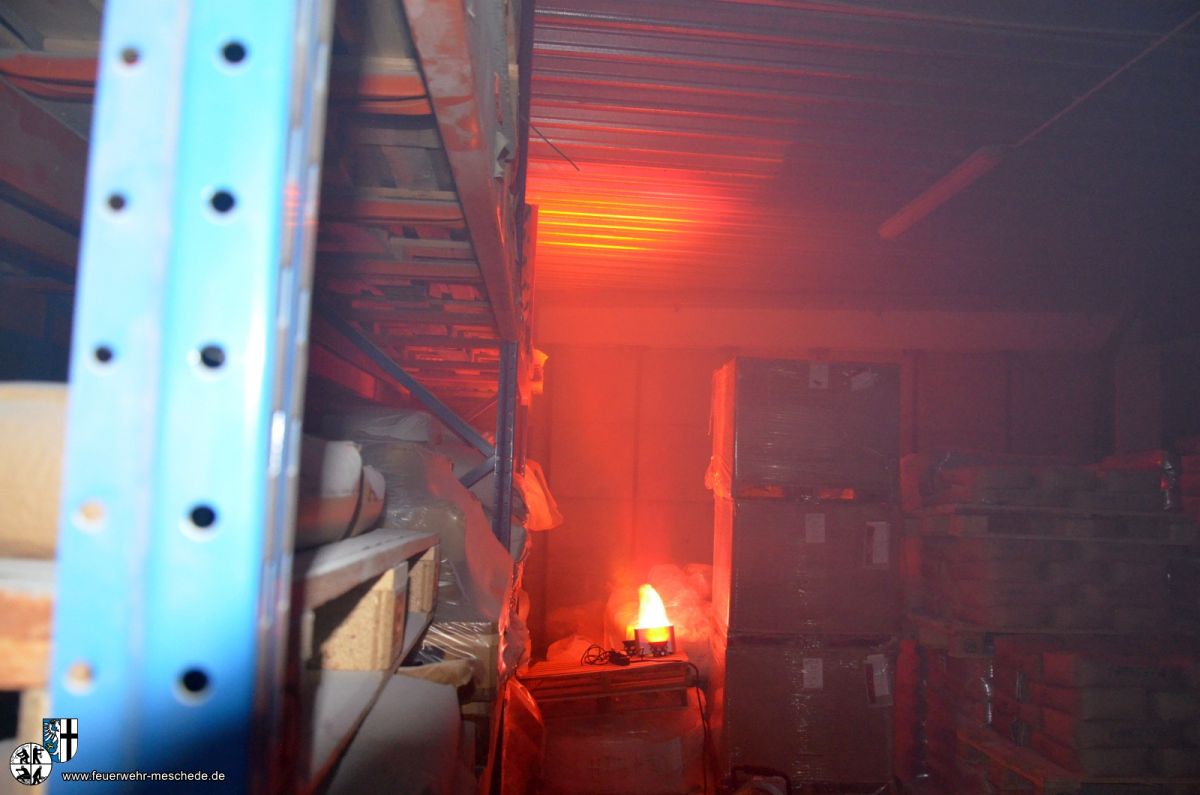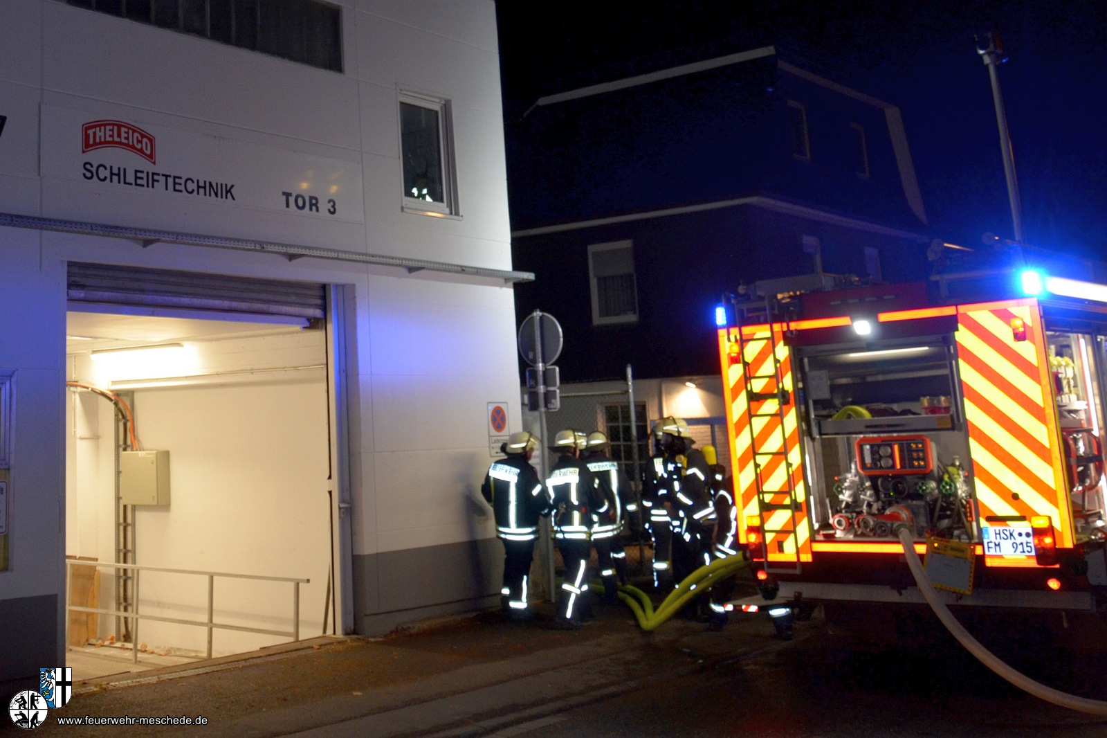 Meschede. Am Montag, den 22.10.2018, um 19.30 Uhr ging zunächst der Alarm der automatischen Brandmeldeanlage bei der Leitstelle ein. Der Löschzug Meschede rückte unter Führung von Philipp Wedeking zur THELEICO Schleiftechnik GmbH & Co. KG in der Lagerstraße in Meschede aus. Nach drei Minuten ging erneut ein Notruf bei der Leitstelle ein. Der Betriebsleiter des Schleifscheibenherstellers bestätigte, dass es in einem Lager zu einem Brand gekommen sei und dass fünf Mitarbeiter als vermisst gelten. Die Leitstelle alarmierte unverzüglich die Löschgruppen Eversberg und Wehrstapel, die Funkgruppe der Feuerwehr Meschede, sowie das DRK Meschede nach.