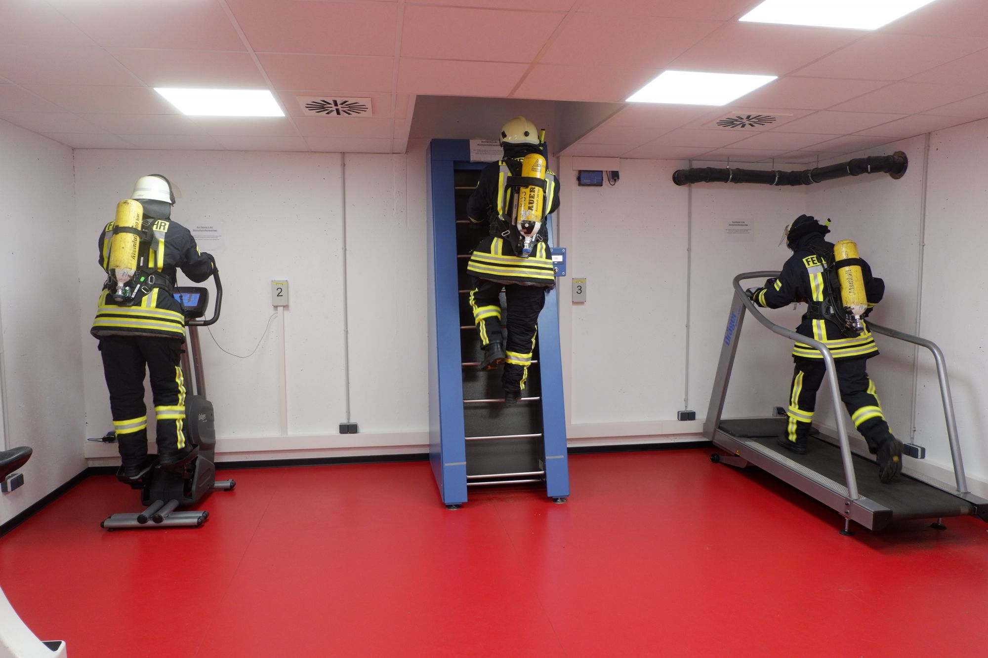 Im Geräteraum wird die körperliche Fitness getestet. Hier müssen die Atemschutzgeräteträger mit vollständig angelegter Schutzkleidung und mit angeschlossenem Atemschutzgerät auf verschiedenen Geräten, wie z.B. dem Laufband, dem Ergometer oder der Endlos-Leiter festgelegte körperliche Leistungen erbringen.