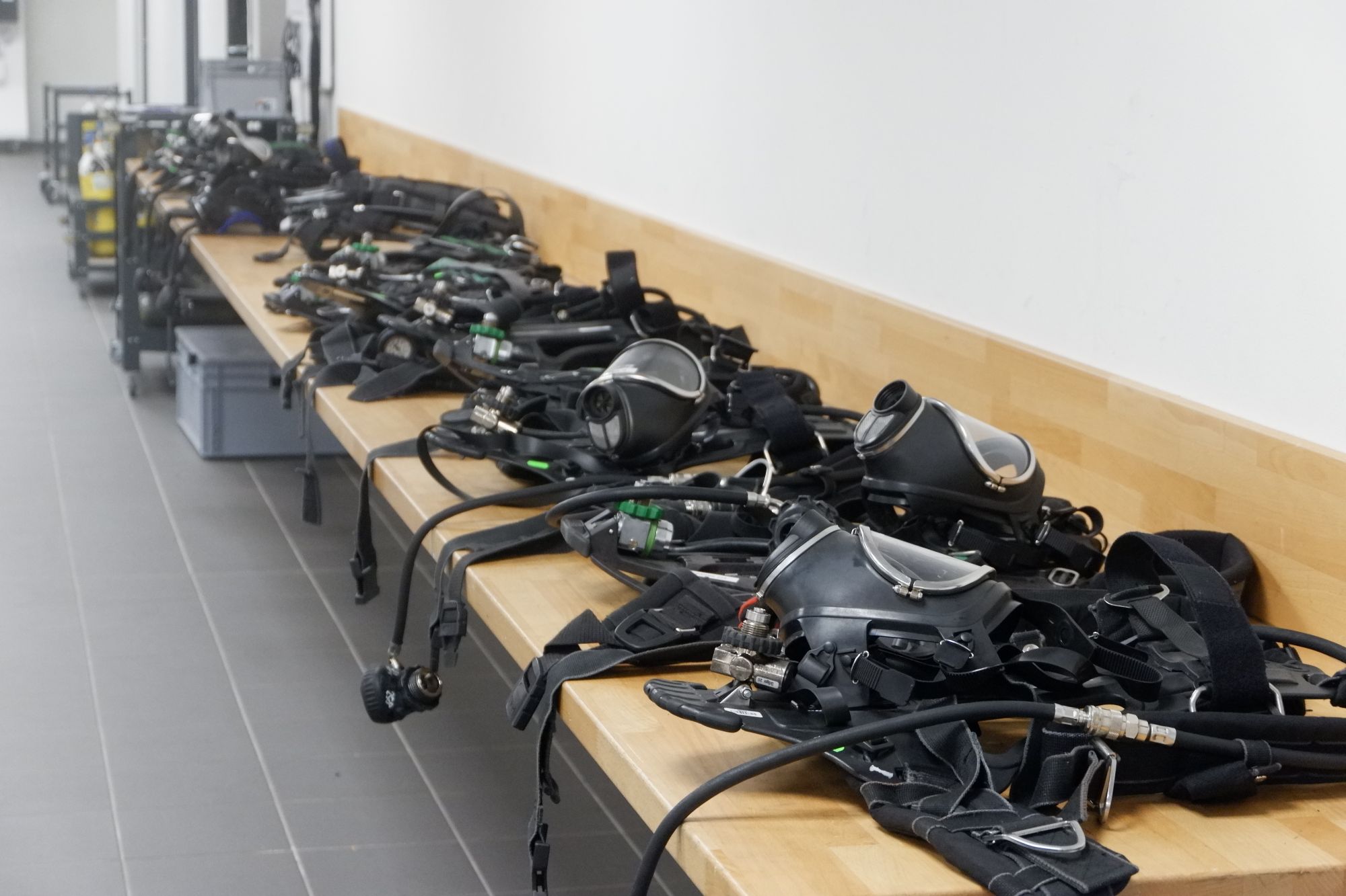 Im Vorbereitungsraum können sich die Atemschutzgeräteträger umkleiden und ihr Atemschutzgerät der Einsatzkurzprüfung unterziehen.