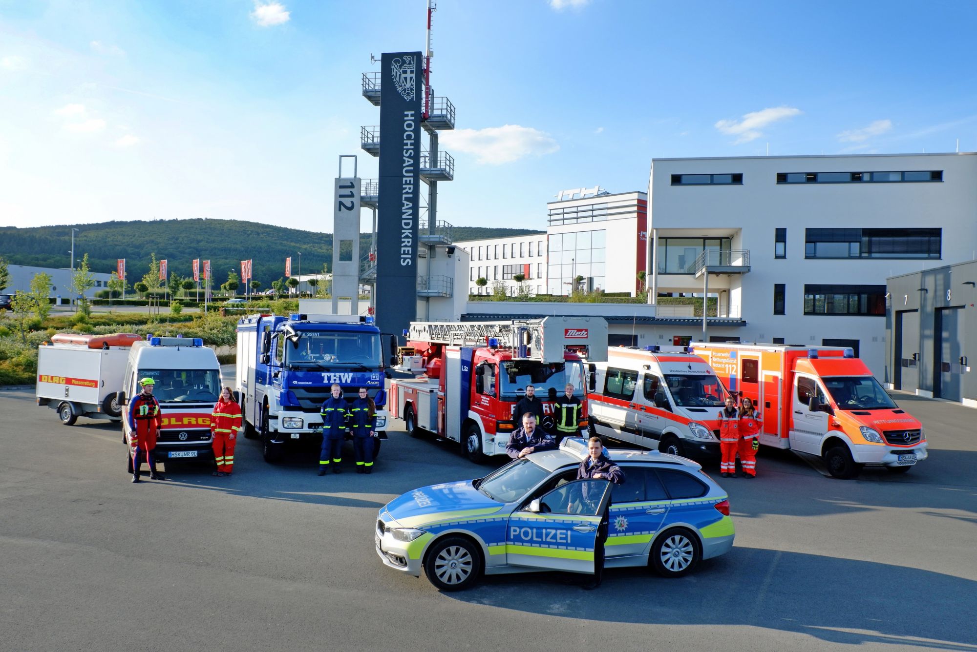Rettungskräfte vor dem Übungsturm des Zentrum für Feuerschutz und Rettungswesen in Enste. Auch hier ist die 112 sichtbar angebracht.