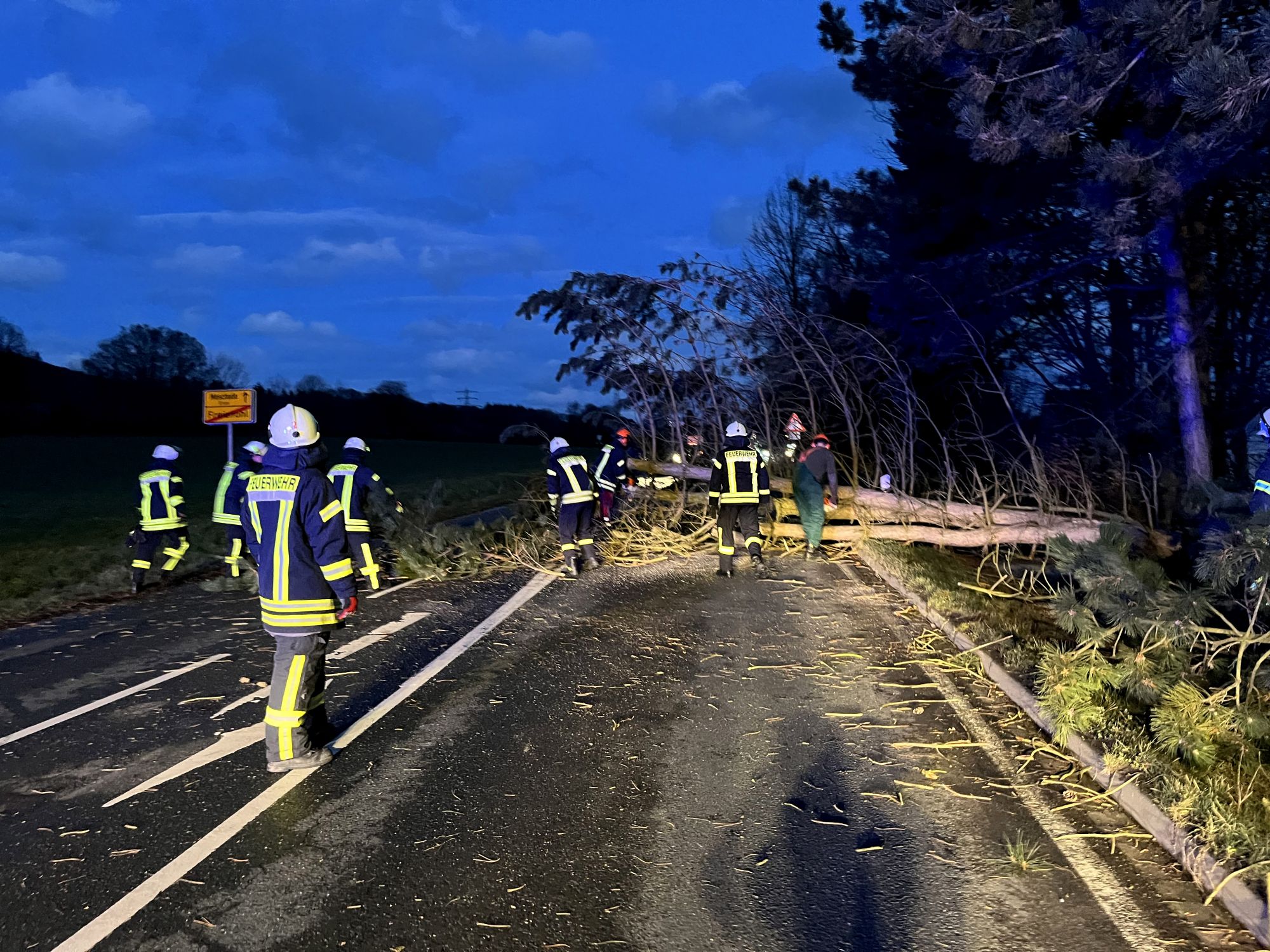 Stadtgebiet Meschede. Um 17:30 Uhr ging die erste Alarmierung für die Einheiten der Feuerwehr Meschede ein. Ein Baum ist auf einen PKW in Mielinghausen gefallen. Zum Glück wurden dort keine Menschen verletzt. Kurze Zeit später trafen, teilweise im 5 Minutentakt, weitere Alarmmeldungen ein. Neben unzähligen umgestürzten Bäumen musste auch ein Einkaufswagenhäuschen gesichert werden. Die L914 zwischen Mülsborn und Schüren und die L856 (Hirschberger Weg) wurde auf Grund mehrerer umgestürzter Bäume gesperrt. Am darauffolgenden Samstagmittag wurde die Löschgruppe Olpe durch die Polizei angefordert. Bäume drohen in Frenkhausen auf die Fahrbahn zu stürzen. Insgesamt wurde die Feuerwehr Meschede 16 mal alarmiert.