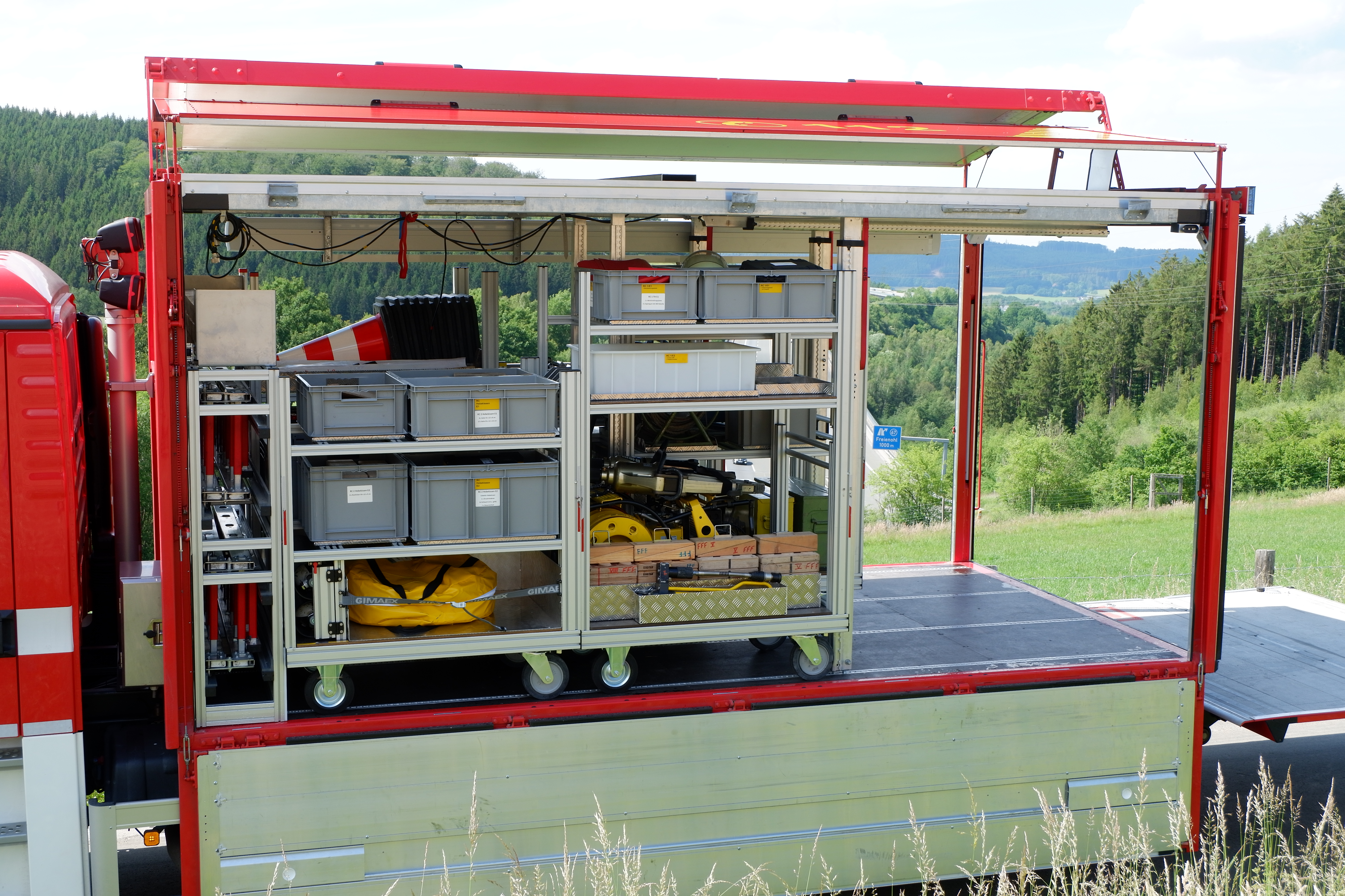 Für den Einsatz als Schlauchwagen verfügt das Fahrzeug über eine teilbare Ladebordwand, Sicherungspunkte für die Person auf der Ladefläche und über Kamera und Gegensprechanlage. Durch eine spezielle Verriegelung beeinträchtigt die Teilbarkeit der Ladebordwand nicht die mögliche Nutzung als Überfahrbrücke für entsprechende Beladesituationen.