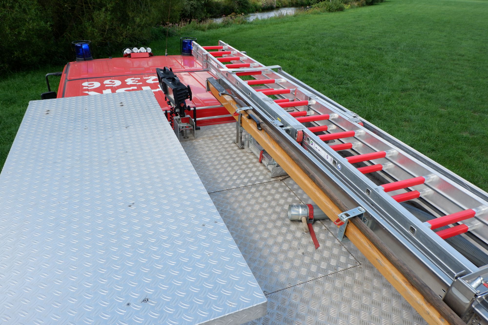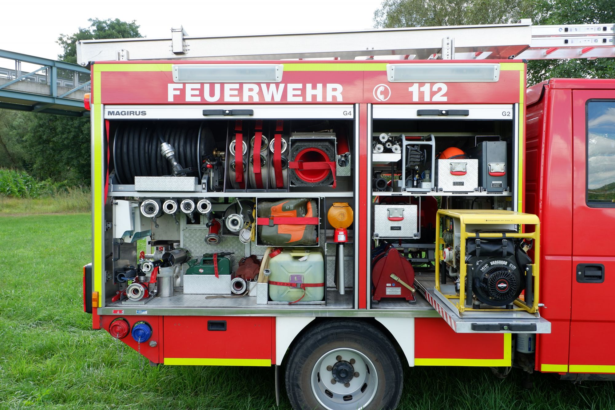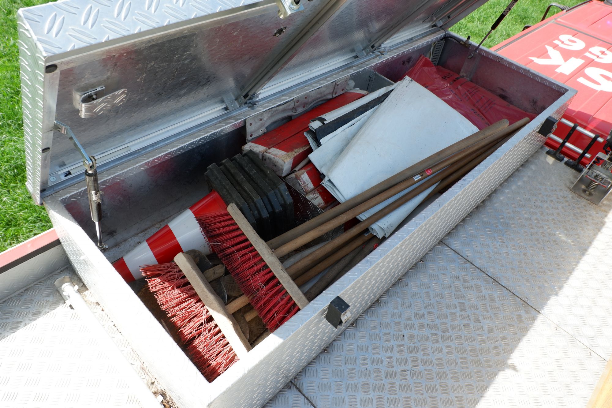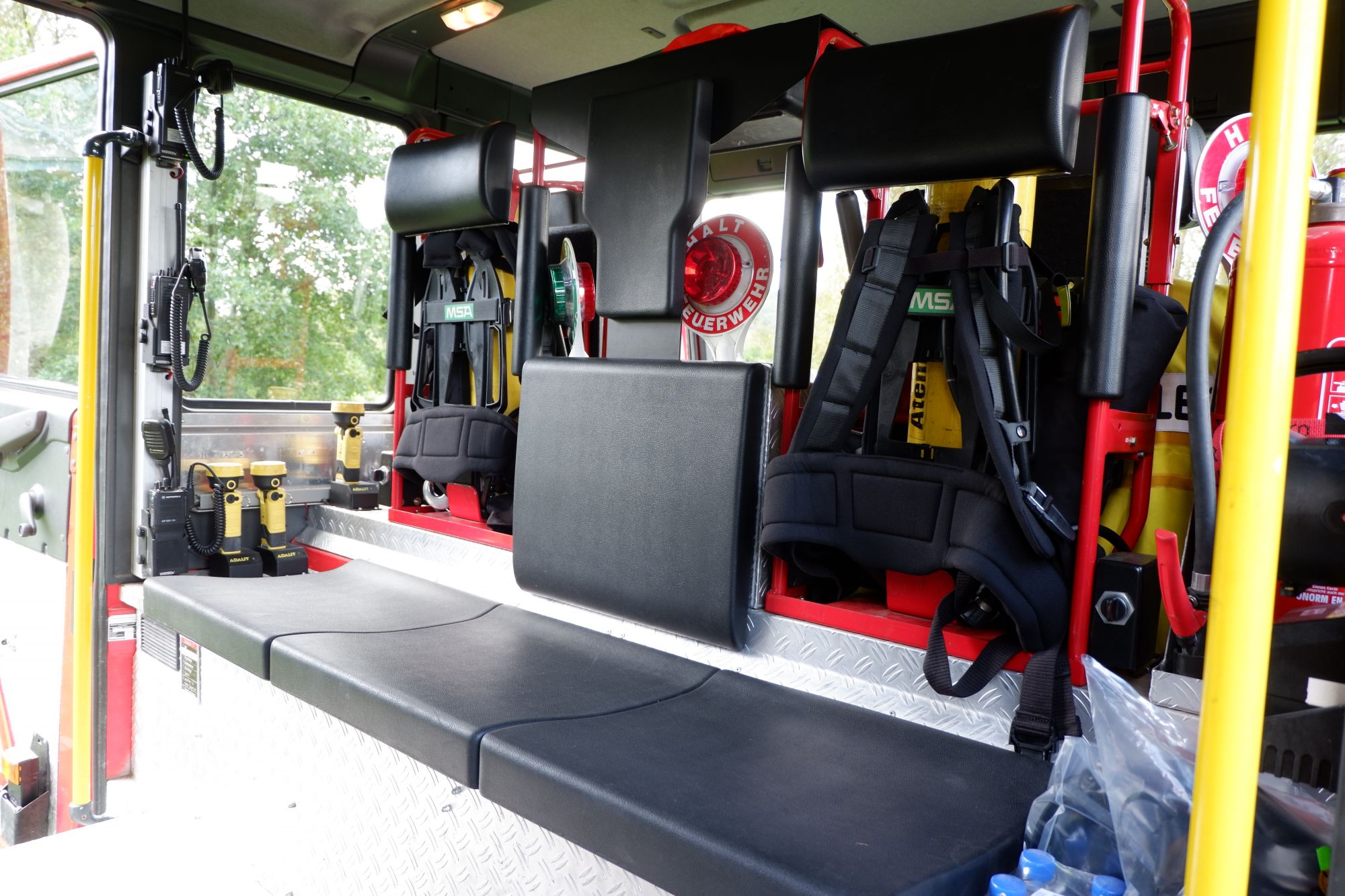 - Zwei eingebaute Pressluftatmer für den Angriffstrupp (Nachgerüstet mit Leinenbeutel und Gurttasche mit Bandschlinge, Kreide und Messer)